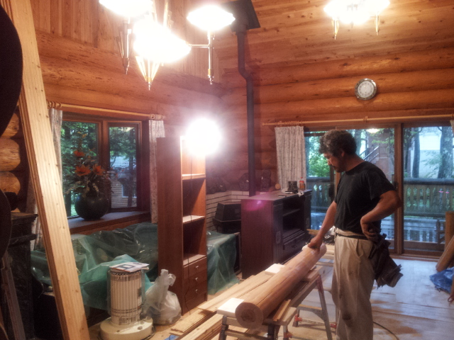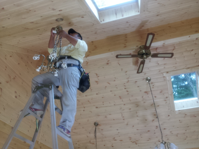 本日の現場作業は軽井沢A邸様仕上げ工事です。室内の材料を外に出し掃除機で細かなほこりまですいとり綺麗にしましたよ。それからサンダーで壁磨き。木肌をすべすべにしていきますよ〜(^o^)。上を見上げるとナベさんが照明器具を手際よくつけていましたよ。照明がつくと完成に近づいきたって感じしますね♪