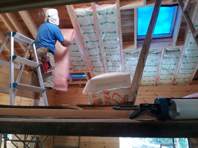 菅平Y邸様は断熱材充填工事始まりました。 屋根屋西山さんも来て屋根下地材貼り終え、雨じまいもできましたよ!  明日からは施主様による塗装工事も始まります。 安全第一頑張ってください。