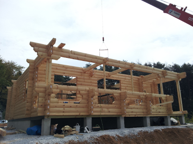 仕事は今週から山梨県北杜市F邸様建て方が始まっています。KH31アレンジD形ラミネートログハウスです。午前中まででログ壁17段まで積んでいます。