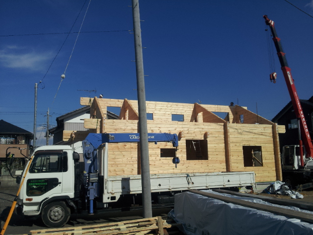 仕事は午前中で棟上げ完了してログ組終了しました。午後からは垂木かけ作業に入ります。安全第一頑張りますね!![]()
