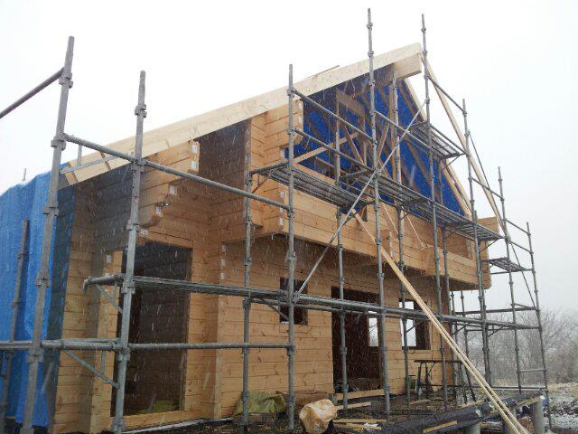 昨日は現場お休みでしたが、嬬恋村黒岩邸屋根垂木と外部足場がかかりました。約30坪の大きさの建物ですが、玄関部分独立、2Fログ壁6段増しのログハウスはかなり大きく見えますね。 6段増しで2Fの空間もかなり広くかんじられますよ!