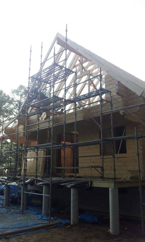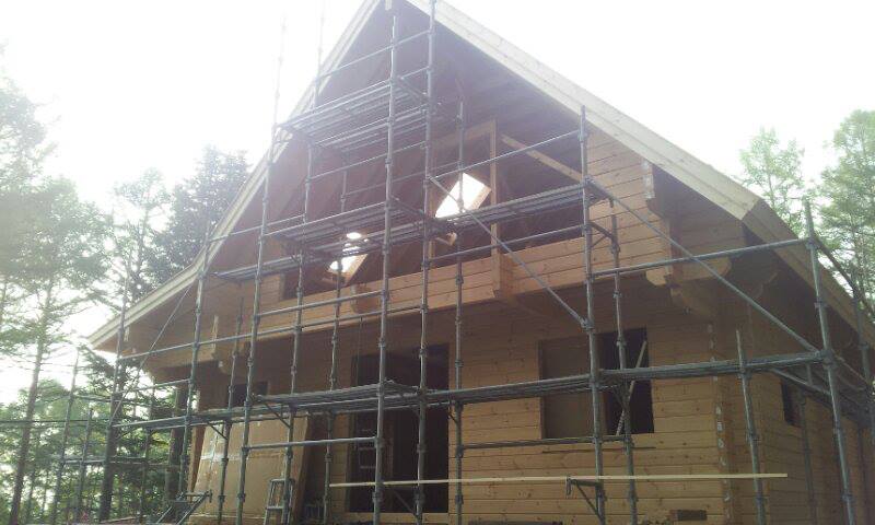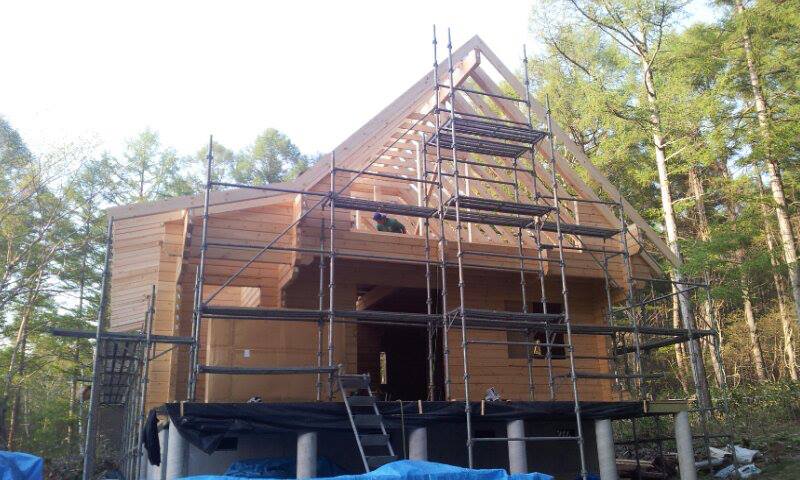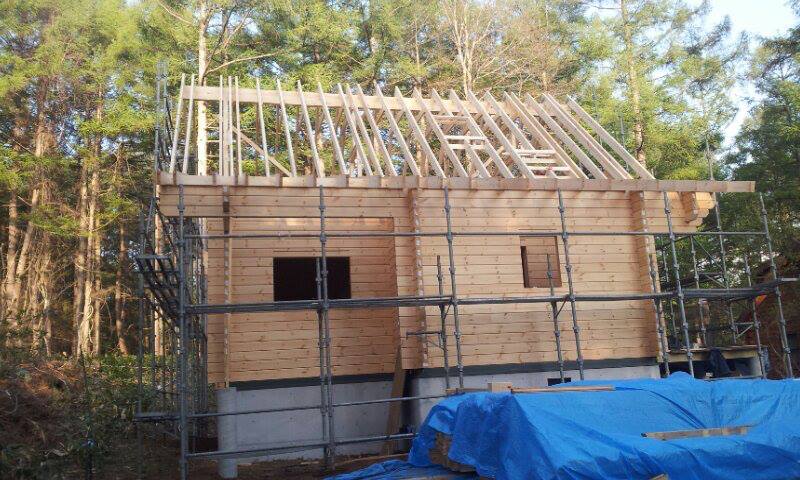 ログ組から屋根垂木工事が順調に進み、昨日屋根下地が噴き終えました。 本日屋根屋西山さんがルーフィングを葺いたので雨じまいもばっちり。 雨もほとんど降らず良かったです。