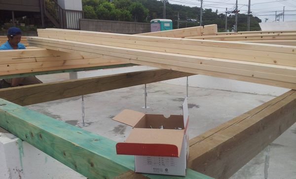 現場は土台を据えて、板金屋さんによる土台板金、1段目〜2段目から根太工事、ステージ作成できました。 ステージの上に窓開口となる13段目までのショート材を配置して本日の作業は終了。