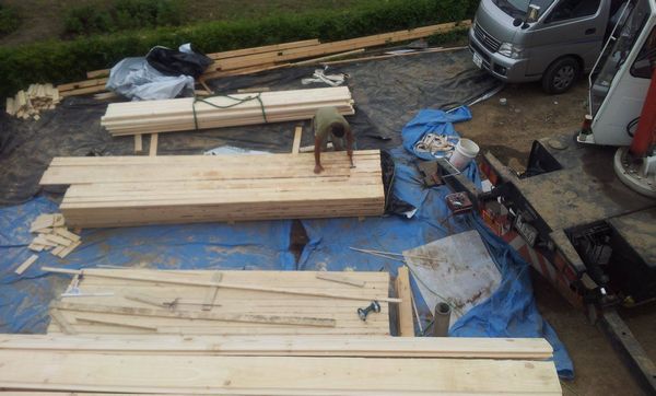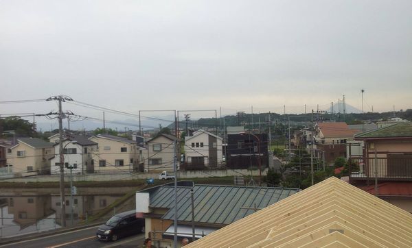 昨日垂木をかけて転び止め施工。 本日は山中大工さんが天窓を施工して、その間三原さんの手が破風板、鼻隠しまわりを施工しました。 桜井の兄貴は野地板を寸法でカットして野地張りの段取りといった役割分担です。 3時頃から野地板一部張り始めました。 5時頃には半分ぐらい野地が張り終わり作業は終了。 棟からちょっと西のほうに目をやると、お〜世界遺産の富士山がみえるではありませんか! 富士山に2礼2拍一礼、 明日は日曜日ですが、山中大工さんと私が残り野地板をはり雨じまい予定です。 安全第一頑張ります。