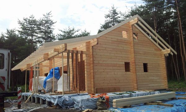 昨日は暑くなりました。 那須にきてから雨と曇りで気温はそれほど高くなかったのですが昨日はよく晴れて気温はみるみる30度超えてしまいました。 さすがにいきなり30度超えはきついですが現場は垂木をかけて家の形になってきましたよ。 O邸様はKL29アレンジモデル小屋裏の部分を有効利用したプランです。 テラス部分は折れ屋根になったいてテラスの空間も広々としております。