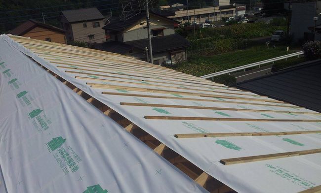 昨日は下屋部分の野地板を施工して、建物部分には少し変わった工法で垂木の上に透湿防水シートを貼りその上に胴縁を打ち付けて空気層を作るという工法です。 胴縁の上から野地板を盆明け施工予定です。