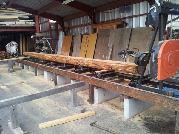 切断は製材所の設備と同様の帯のこを採用しているので正確な寸法でカットすることができるすぐれものの製材機。 弊社倉庫では専用レール12mが設置しておりいつでも簡単に丸太を製材することができます。 この製材機を利用すればポスト&ビームの加工の手間が簡素化できるでしょう!