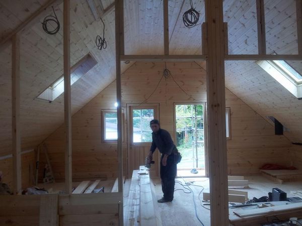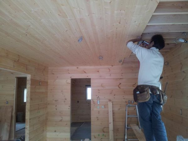 トラックのスピードがでないので8時半に現場に到着。 現場では大工の柴田さんと岡山さんが手際よく作業進めていました。 1階では床が張られ天井もあと少しになっています。 2階では天井が張り終わり、間柱、ログパネル施工が行われていました。 現場内も清掃管理がしっかりされていて大工さんの仕事ぶりに感心です。