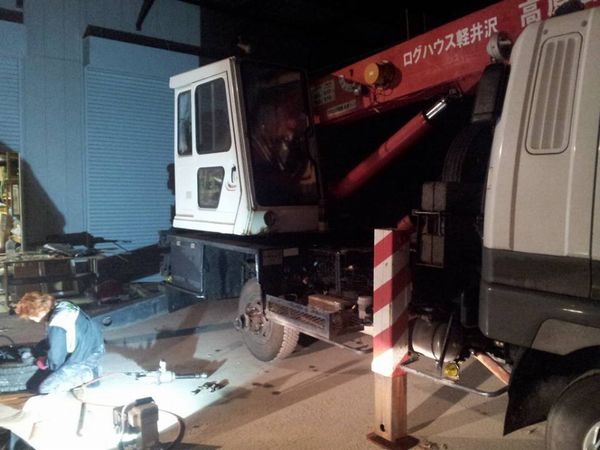 タイトルにてちょっとしたハプニングと書かせていただきましたが、昨夜こちらに来るために夜11時ごろトラッククレーンで出発しました。 走り出すこと20分。 軽井沢付近で「バーン」と後ろから音がして、降りて確認してみると右後方タイヤがパンクしているではありませんか!いや〜どうしようかなと思って社長に相談。 いつもお付き合いのある深井タイヤさんに申し訳ないと思ったのだけど夜12時ごろ電話しました。 深井タイヤさんは「いいよ、いまからいきます」と深夜にもかかわらず修理にきてくれました。 トラッククレーンの後ろタイヤはダブルのため走ることができたので軽井沢から倉庫まで戻り、戻ったと同時に深井タイヤさんがきてくれました。 手際よく修理してものの20分で修理完了。いや〜早かったですね。F1タイヤ交換のシーンかと思いましたよ。 そんなハプニングで1時倉庫出発。 遅れをとりもどすために休みなしで走り6時袋井に到着しました。 1時間の睡眠で走ってきたので日中はかなりきつかったですが無事荷下ろしできてなによりです。深井タイヤさんありがとうございました。