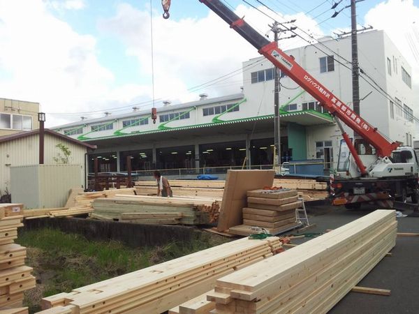 朝8時荷下ろし場所にコンテナが到着しました。 S邸様はコンテナが現場近くに入れないのでS様が探してくれた場所にて荷下ろししました。 場所がちょっと狭いのでコンテナを道路に横付けして荷下ろし場所に入れ込むという作業なので少々大変でしたが夕方無事荷下ろし完了です。 暑いコンテナの中で頑張ってくれた山中、佐藤大工さんお疲れ様でした。