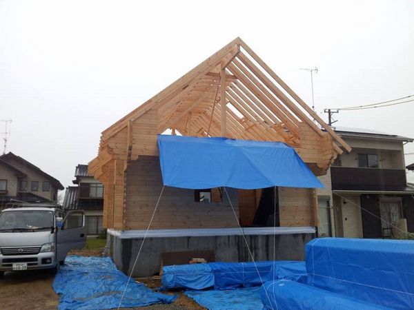 小雨ならどんどんやってしまうチーム高原ですが、雨も強くなってきたため垂木にブルーシートをかけて大工さんは天窓の下地、煙突下地の施工をしました。 私は2階からブルーシートを張り屋根をもうけて野地板の段取りをしました。