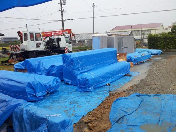 施主のS様は台風対策で仕上げ材などのブルーシート養生。 風でとばないようしっかり紐で結んでいきます。