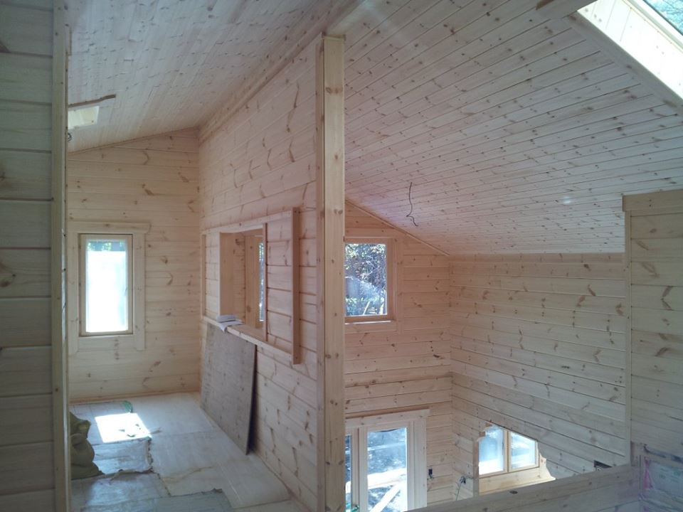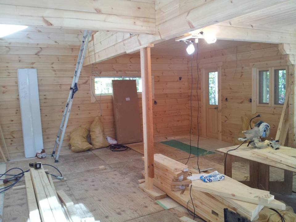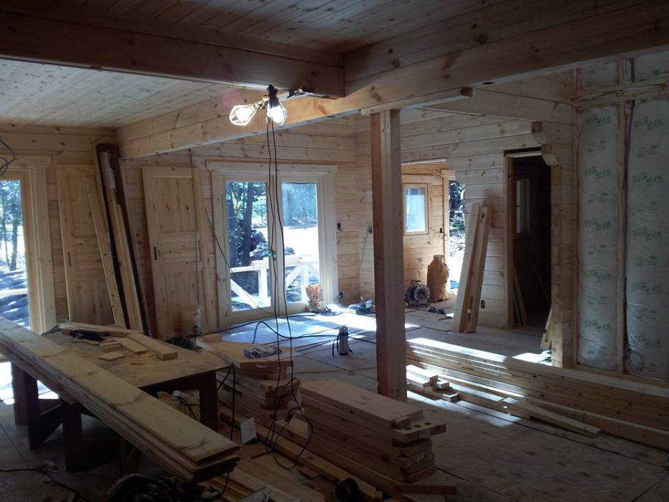 内部造作工事は2Fはほぼ終わり1Fの造作工事にとりかかっております。 T様邸は1階はログ、2階はツーあバーイ工法なので2階の間取りの設計は自由がききます。