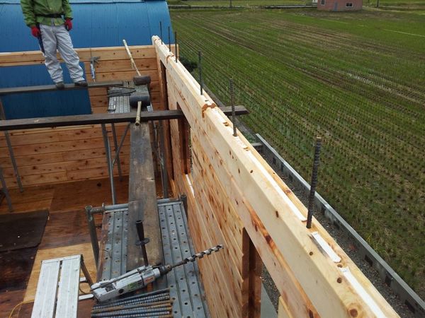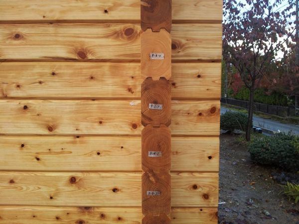 昨日はログ積み5段目から12段目まで積み上げました。 本日は12段目から16段目まで積み上げております。 国産檜材いいですね〜! ログ積みしておりますがパインとは一味違う!耐久性抜群だと思います。 無垢材ですが、材はすなおで真っ直ぐ。 ひび割れもありません。 ログ一段一段がぴったりとついています。