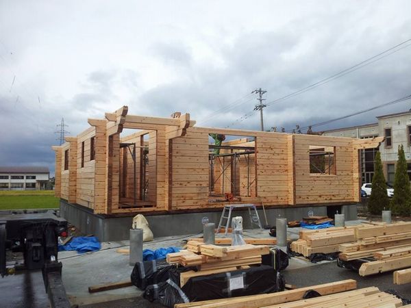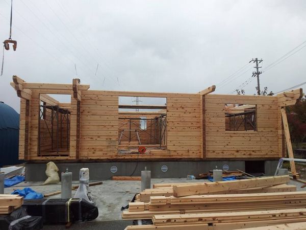 先週金曜日からいったん群馬に戻り、昨日から富山県宇奈月町K邸様の檜ログハウス建て方工事進めております。