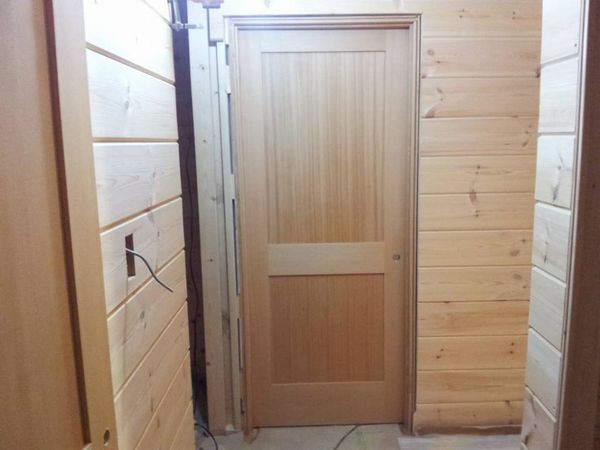 1階では内部ドア吊りこみました。 定番のパインドアではなくツガのドア。 無塗装でしがクリアー塗装すれば色に深みがでるのでいい感じになると思います。