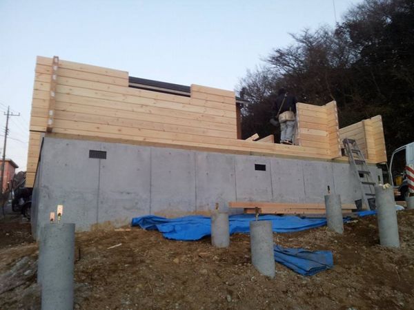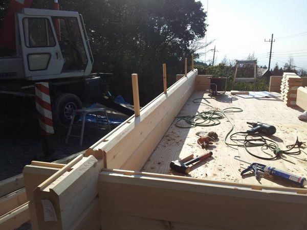 昨日は現場近くのドライブインの敷地をお借りして荷下ろししました。 中国ログハウスなのでマンパワーですが、H邸様のログ材は92mmのラミネート使用なので材料が比較的軽い。 いつもより負担なく下ろすことができました。 2時ごろ材料を下ろし現場にて1段目からログ組スタート。 昨日は1段積んで現場終了しました。