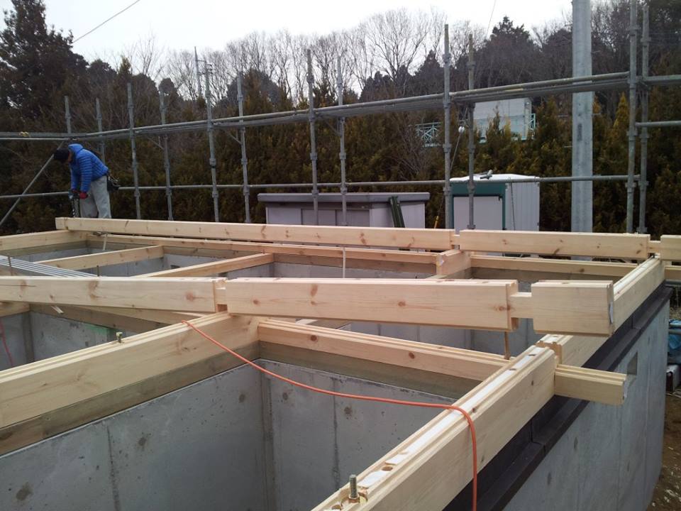 店主のバッチリ! を仕事にも! 本日のお仕事は基礎部分に墨をつけて土台を伏せます。 土台からログ壁1段、2段。 アンカーボルト部分はログ壁に穴をあけてログ壁と基礎をしっかり固定しました。それから昨日加工しておいた1F根太部分を施工して作業終了。