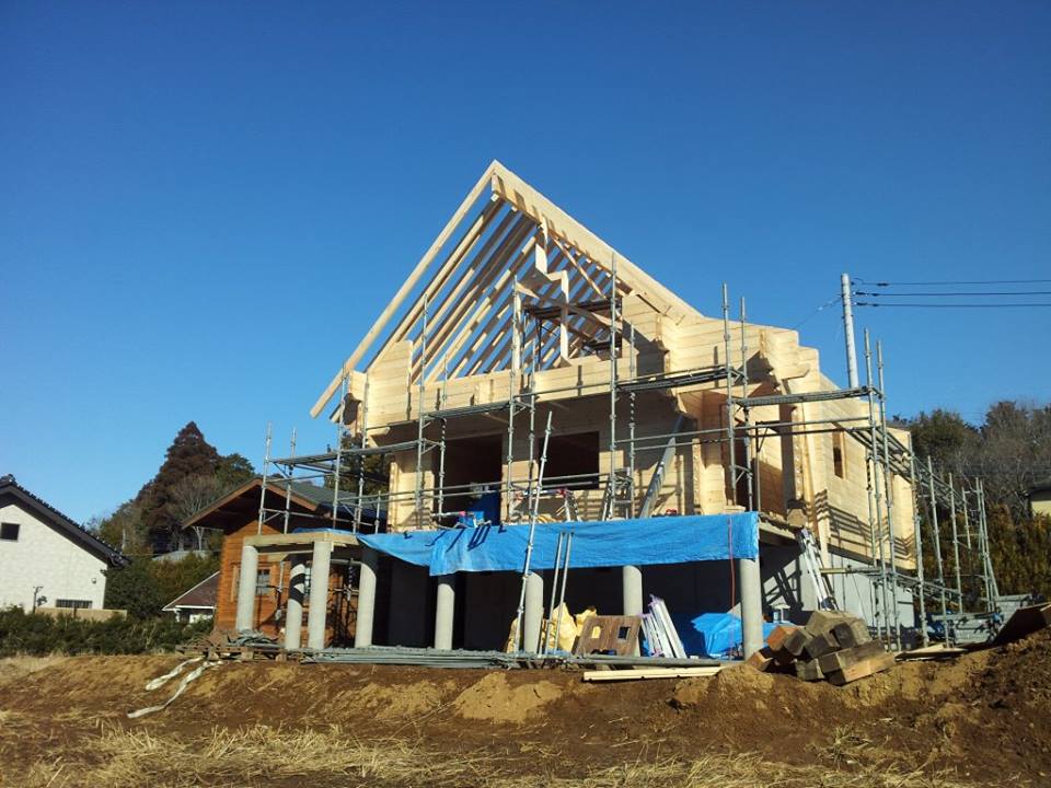 いい天気の中作業は順調に進みました。 朝一番で棟木がかかり、昨日クレーンにて垂木を2階部分にあげておいたので10時には垂木がかかり家の形になりました。