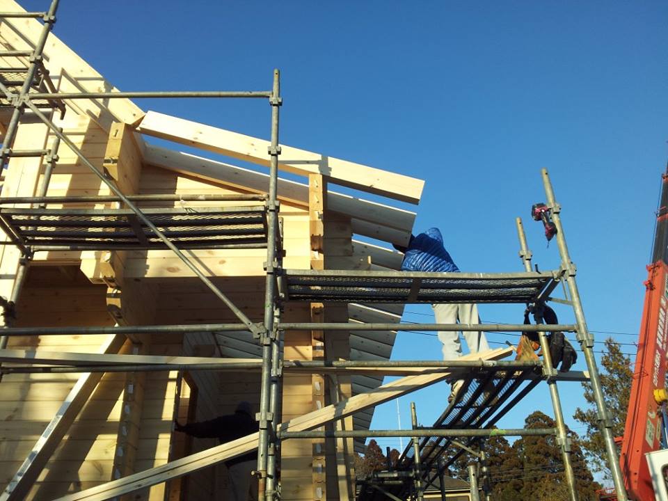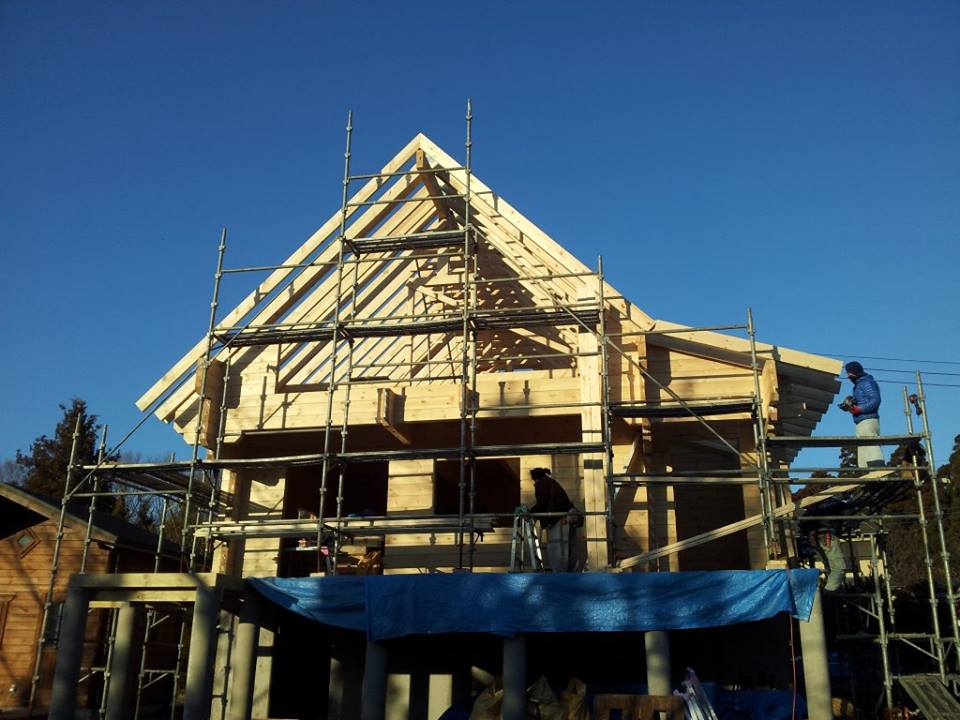 3時からは棟木の金物、垂木とログ壁をつなぐL金物をうちつけて作業終了かと思いきや、破風、鼻隠しも施工できました。