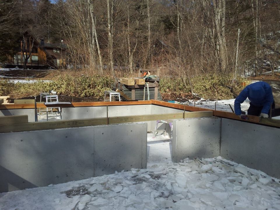 仕事は土台伏せ工事や現地への材料搬入作業です。 基礎内には5センチぐらいの氷がかたまっていて氷も撤去しなければなりません。 本日は大引き、根太組み作業予定です。 安全第一頑張ります。