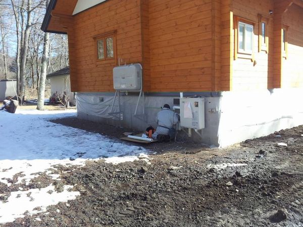 O邸様から車で5分の場所に建築中のI邸様中国ラミネートログハウスの現場は造作工事終わりクリーン設備さんが設備器具を取り付ける工事していました。 裏でボイラー取り付け作業中でしたよ。 電気屋さんもおわり、もう少しで完成となります。 ![]()