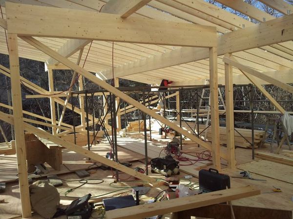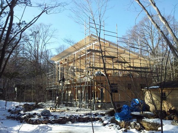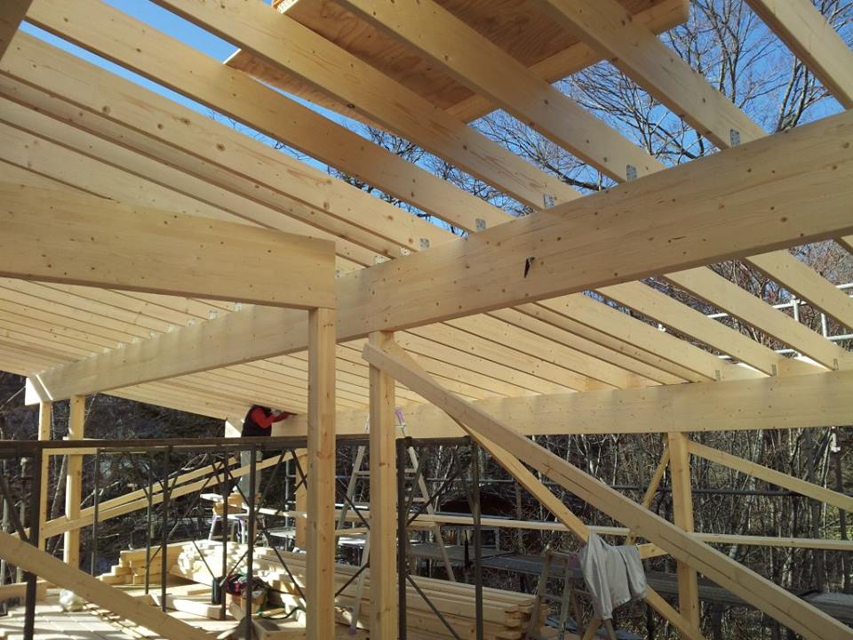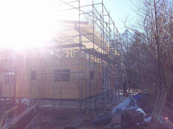さて昨日のお仕事ですが軽井沢O邸様フィンランドログハウス建て方工事屋根垂木がかかりました。 片流れ屋根なので垂木長さは11m弱。 こんな長い垂木は今まで15年建築してきましたけど見たことがありません。 弊社クレーンで梁上に乗せて前後の長さをみながら身長にとめていきます。 垂木をかけおわるとL金物、転び止めでしっかり固定していきます。 煙突開補強もバッチリ。 本日の野地張りに備えます。 足場屋さんもグットタイミング。 いつもの3人のメンバーで手際よくかけていきましたよ。![]()