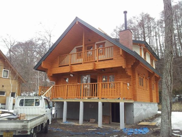どうですが高原都市開発では珍しい片流れの大きなログハウス。 2階バルコニーは南、西にありすべて屋根がかかります。 う〜ん格好いいですね〜。   明日からは2階外部壁の工事入ります。 工事進行状況が楽しみ。 内装もかなり懲った感じになりますので乞うご期待です。