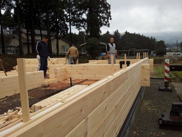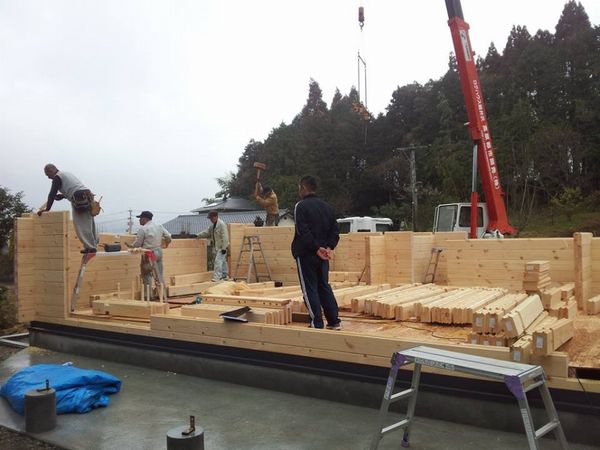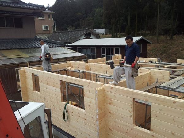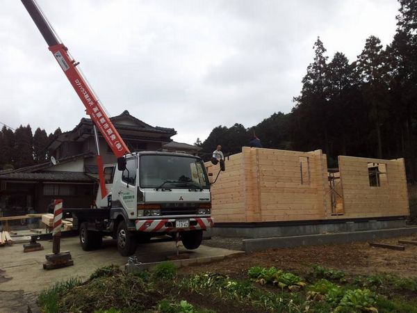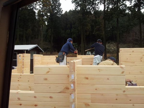今日のログピスト野口展孝のお仕事です。 佐賀県H邸様建て方工事2日目となりました。 1日目で荷下ろし、1Fステージ作成していましたので今日はログ2段目からのスタートです。 H邸様はお父さんが大工さんで施工はお父さんの工事となります。 お父さん含め地元大工さん3人、 弊社は私と山中、佐藤大工さん、滝沢さんは搬入作業といったメンバーで臨みます。 地元大工さんはログ積み始めてだったため最初は手間取っていましたが、なれてくれば動きもよくなってきます。 電気穴にダボを打ち込んでしまったというミスがありましたがすぐみつけリカバリーできました。 その後は順調に作業をすすめログ壁15段目まで積み上げることができました。 滝沢さんもユニック運転ふる活動。 ログ材をすべて敷地に搬入。 造作材も現地に80パーセントほど搬入できております。 本日も職人さんたちに頑張ってもらいました。![]()