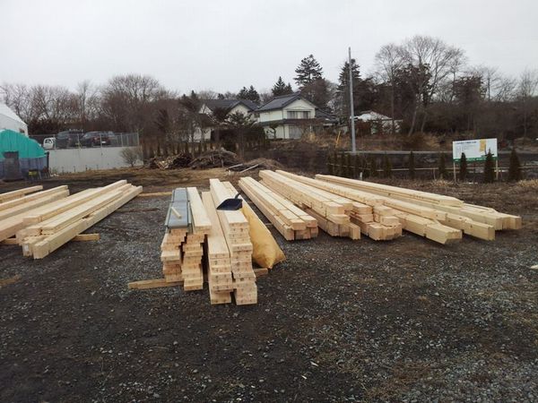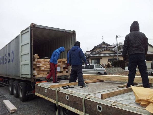 そして8時から荷下ろし開始。 中国ログハウスはマンパワー!人力作戦です。 コンテナの中に2人入りでてきた材料を手際よく外で待機してる4人がまとめます。 構造材、仕上げ材、ログ材の順でコンテナから引き出し、約34坪の建物が半日で荷下ろしできました。 この人力作戦結構つらいですがメリットがあります。 梱包材と違って材をコンテナから引き出す際にログを順番ごとに仕分けられるのです。現場で荷下ろしすることは滅多にないのでこの仕分けで運搬や材料の仕分けがすぐできることがメリットです。 また梱包材でくるとどうしてもキットのボリュームが増えコンテナが2台必要になってきます。 1台なら海外からのコンテナ費も抑えられるのでキット価格もコストが抑えられるのです。 このような手下ろしのログメーカーはあまり少ないと思いますが、お客様に価格を還元できるのがメリットなんですよ。