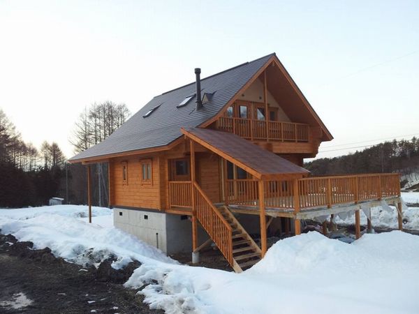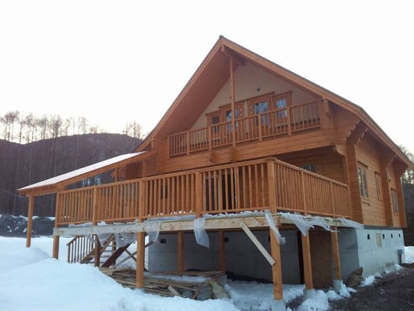 I邸様は中国ログハウス105mm×175mmラミネートログです。 高基礎、広いテラスなので建物に迫力がありますね。 細かい部分を仕上げればもう少しで完成となります。 ![]()