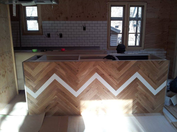 軽井沢O邸様ログハウス新築工事も終盤になってきています。 大工造作工事はほぼ終わりこれから設備工事にとシフトしていきます。 キッチン前のパネルには「ヘリンボーン」のフローリングが施行されました。 どうです! お洒落でしょう〜。 キッチン壁面のタイルと調和していい空間になりそうですね。 大工さんは工事が大変なので嘆いていましたがいい感じになりました。 O邸様見所いっぱいです。 是非夢丸さんに取材きてもらおっと!!