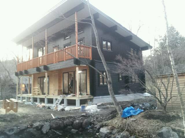 本日足場も外れて外観がよくみえるようになりました。 ログにはみえないけどログハウスなんですね〜。 完成楽しみです。