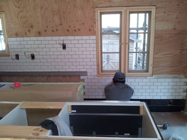 軽井沢O邸様キッチン全面パネルはヘリンボーン!