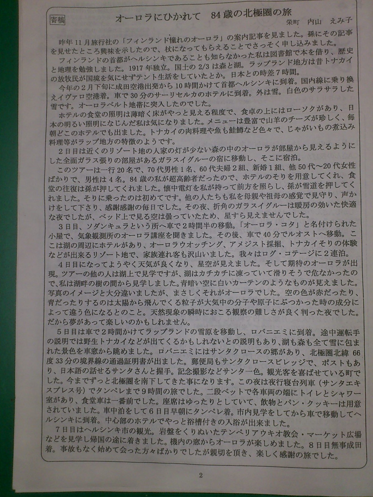 東村山市の高齢者向けの発行誌に寄せた 「オーロラに惹かれて 84歳の北極圏の旅」