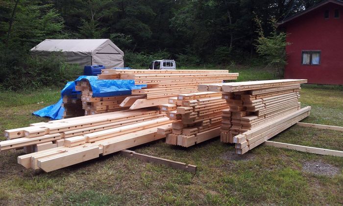 中国ログキットはまずは仕上げ材から降ろされます。 天井材、床材、壁材、構造材、ログシェルという順番に下ろすのですがログシェル以外の材料が結構時間かかるんですね。 11時にようやくログシェル以外の材料を下ろしあとはログシェル。 ログシェルになったら結構スムーズに下ろす事ができます(重いですけど)