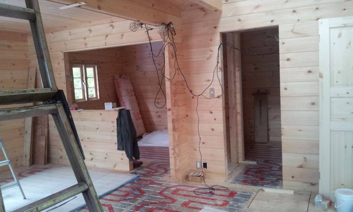 2F造作は形になりました。 1Fは昨日床暖房用のフローリングが届き今日から施工予定となっております。 フローリングをはってイケアのキッチンを組めばほぼ形になります。 イケアキッチンはカスタマイズしてお客様御要望のログハウスにあったタイルの天板、ウッドの扉にして仕上げます。 いい感じになると思いますよ。 テラス部分はアクリル板にて施工。 1F部分が暗くならないように全面アクリル板になります。