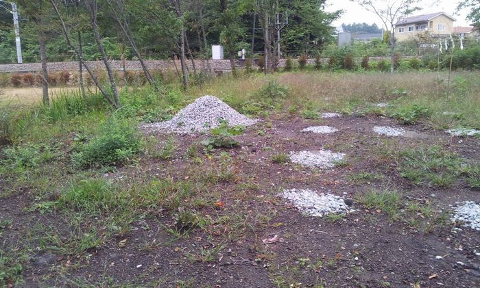 採石が点々と地面に埋まっている写真は軽井沢で建築予定のY邸様現場です。 地盤調査の結果、地盤改良の必要ありの土地です。 点々とした採石はハイスピード工法にて地盤改良がなされました。 特殊機械で穴を開け、そこに採石を敷き詰めていくという新しい地盤改良です。 コンクリート柱ではなく採石柱となっているイメージです。 こちらの工法2年前に愛知県蒲郡市でも使わせていただいた工法です。 コストはコンクリート柱の改良とそれほど変わりないですが、環境にも配慮したハイブリットな工法です。 是非皆様御検討下さい。