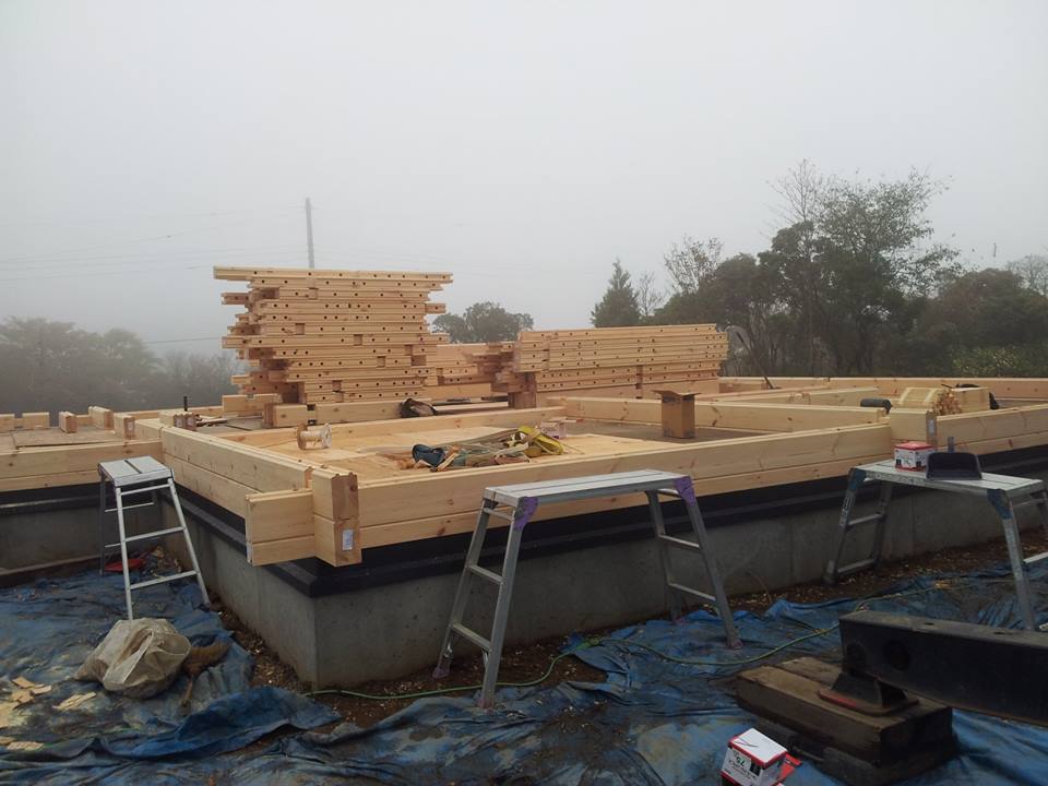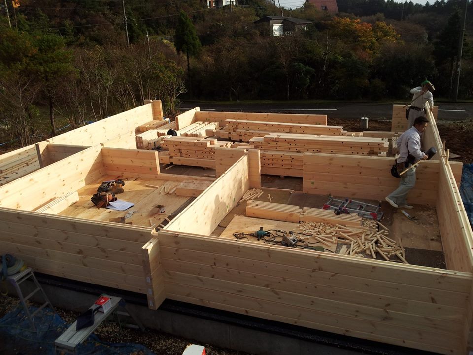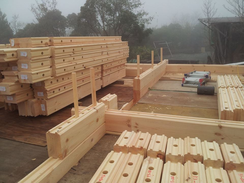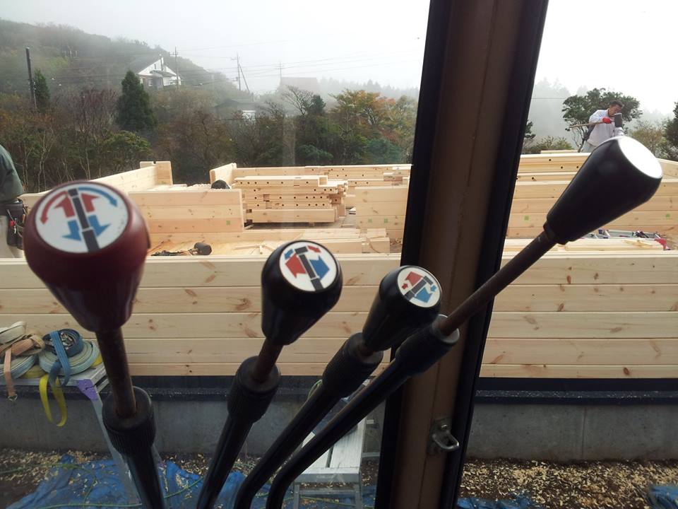 仕事は昨日ログ2段まで積んで基礎からのアンカーボルトと固定しました。 今日は根太組み作業からです。 大工さんたちが根太組みの段取りをしてる中、私と滝沢さんは仮置き場からのログの搬入作業です。 13段目までのログに気密防水テープをはり、窓下までの材料13段分を現場に運び入れました。 現場では根太組みが終わりステージ作成。 ログ組みが本格的に始まります。 ログとログを固定するダボをしっかり打ち込んで積み上げていきました。 本日はログ2段から10段目まで積み上げ作業終了。 いい感じで作業進んでおります。