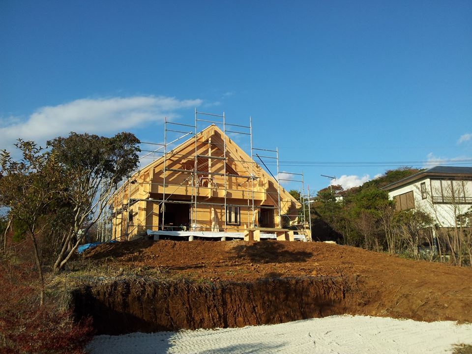 午後から野地板施工。 破風まわりの施工を施し屋根の形となってきました。 本日雨仕舞いができる予定となっています。 電気配線工事もほぼ完了。