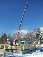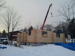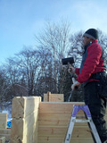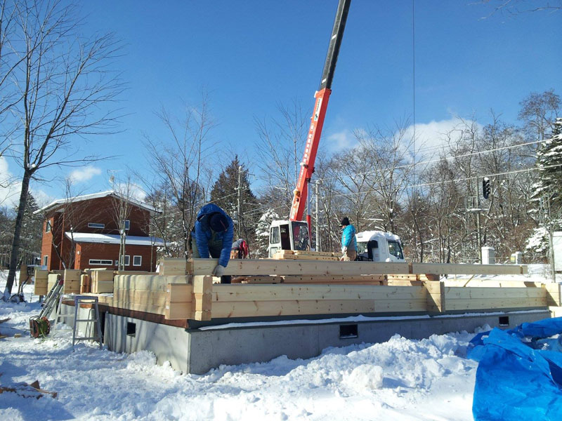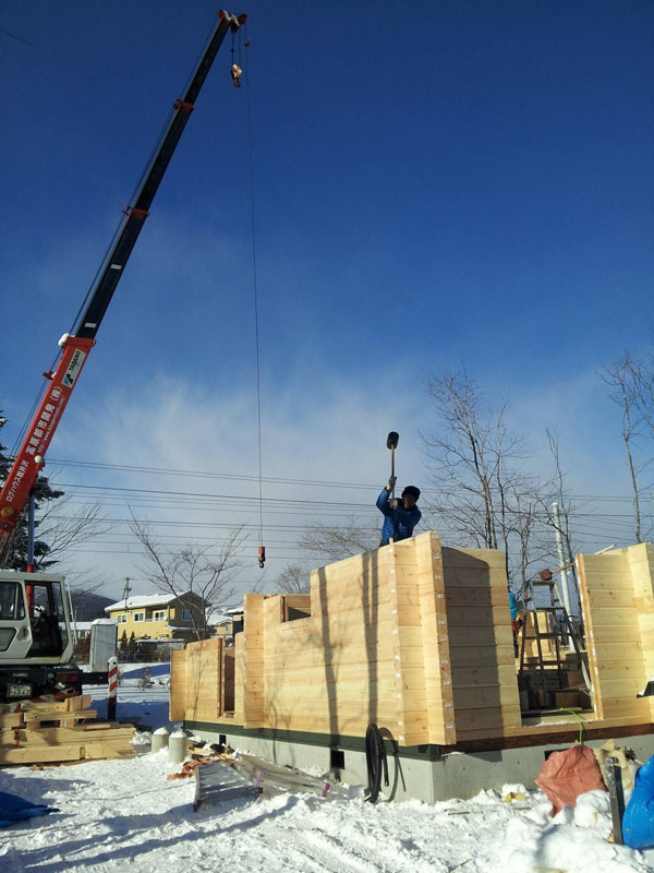軽井沢M邸様エストニアラミネートログハウス建て方工事昨日かなり進みました。 雪の影響で雪かき工事からのスタートでしたが手際よくログを積み12段まで積み上げることができました。 寒いのでログ積み工事はもってこいですね。 ダボをうつと体が暖まります。