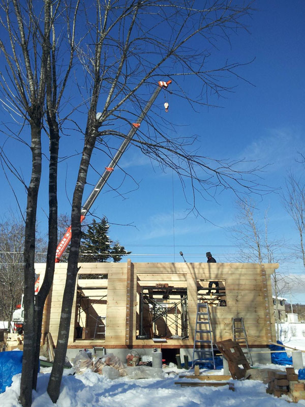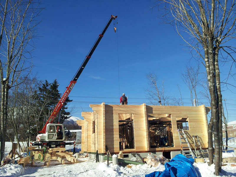 昨日は引き続き軽井沢M邸様建て方です。 山中大工さんが休みのため急遽滝沢さんもログ積みにかりだされました。 13段目からでしたが内部に足場を組んでからの作業。 13段目からは窓の上や開口の上になるのでログ材は長くなります。 長いのでダボの本数も打ちますのでかなり職人さんはハード。 私はクレーン作業、番だし作業です。 効率よく作業を進め、昨日ログ17段まで積み上げる事ができました。 今日は2F床組作業をしてログを増している分のログ積み作業になると思います。