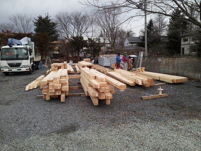 2台はおよそ2時間で降ろし終え、それからみんなでログの防水テープを張りこみます。 材を仕分けながらテープをはり、滝沢さんが一人で運べるように段取りよく仕分けていきます。