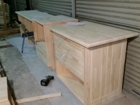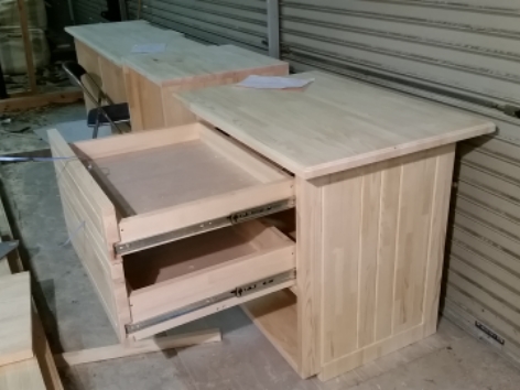 それでは今日のお仕事。箱根の現場も終わりに近づき、施主さんから色々と細かいものの製作依頼があったようです。あれこれ考えながら造り形になってきました。キッチン前の作業台を製作しましたが、奥行きが結構あるので2段スライドレールを使ってみましたよー!550ミリの引き出しすべて出てきますよ。奥まで全部見えるので使いやすいかな?なんて思っているマーモンです。