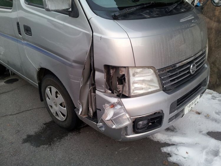 1月の出来事で大きかったことは私の愛車キャラバン君を凍結スリップ事故により失ってしまったことです。 その日は物凄いすべりました。夜中だったのですが雪が溶けてそれが凍りアイスバーン状態に。  私のギャグは滑らないのですがタイヤは思いっきりスリップしてしまいガードレールに一直線。あたったとおもったら反動で反対の擁壁にもぶつかってしまいました。 1度の事故で2度の衝突。 幸いにも怪我はなかったのですが愛車のキャラバン君は痛々しい姿になってしまいました。