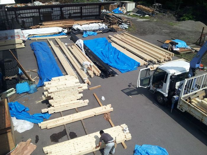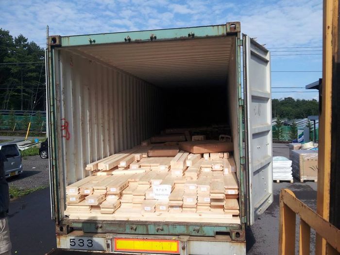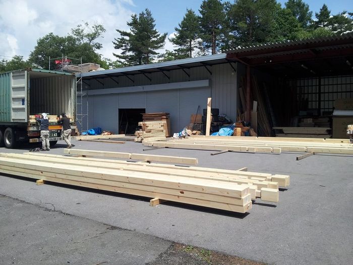 昨日は弊社倉庫に嬬恋村プリンスランド内別荘地に建築するA邸様のログキットが到着しました。 現地にコンテナを入れて下ろそうかと思ったのですが、最後の交差する道が曲がれるか曲がれないか不安だったので倉庫で荷下ろしとなりました。 久々の中国ログキット! さあ、みんなで一本づつ引きだすぞ! ということで8時から荷下ろしを開始して11時半には下ろし終えました。 倉庫だったのでフォークリフトを使ったりでひかくてき楽に荷下ろしができました。 いつもはパソコンのマウスしかにぎっていない設計士の本海さんも呼び寄せてたまには肉体労働をしてもらいました。 体を動かしたのでリフレッシュできたでしょう(笑)