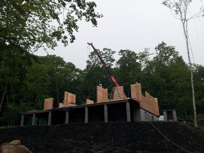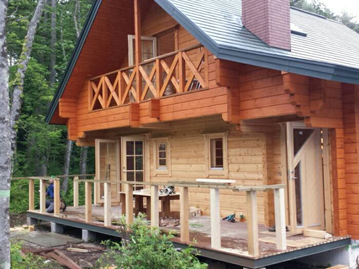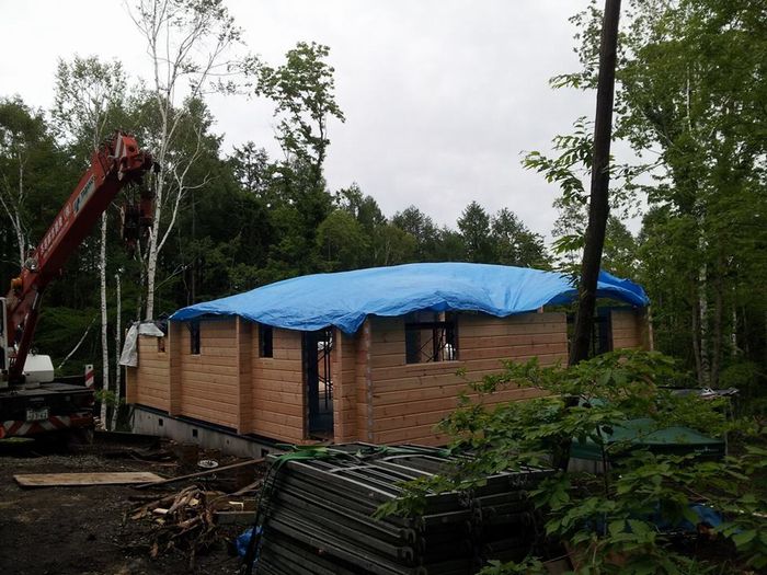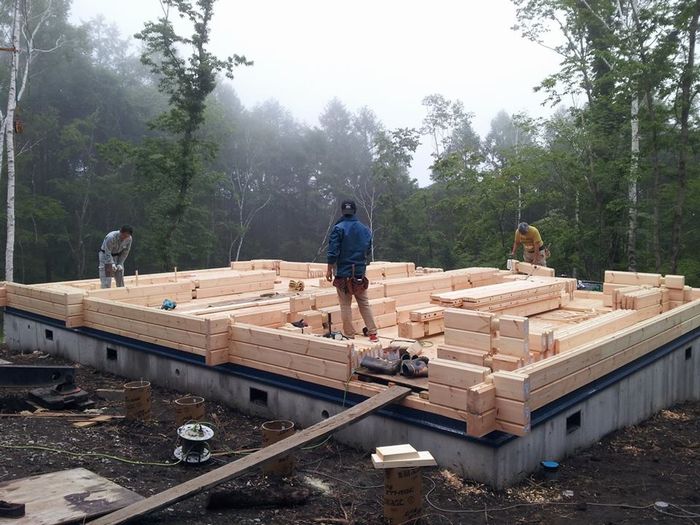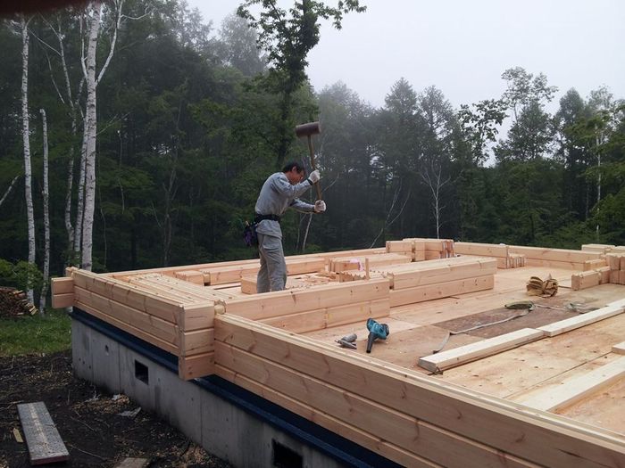 標高1100mぐらいの山ですので天気が急変することも心配しましたが、雨は一日もってくれました。 いや〜ラッキー!! 一日得しましたね。 工事は一昨日ステージとテラス根太まで工事していましたのでテラスにもテラス材を並べて足場をかためました。 ステージに積んであった13段目までのショートログを振り分け、あとは順番通りにログ組み開始。 私とマーもん、八坂大工さん、N様とで12段目まで積み上げることができました。 12段目から高くなるので足場を組み上げ昨日の作業は終了しました。
