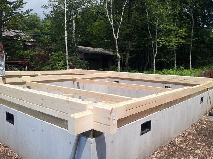 昨日からプリンスランド内A邸様の建て方工事が始まりました。 私は一昨日倉庫で下ろした材料を運搬する係りです。 現場では土台〜ログ1段、根太工事が施工されました。