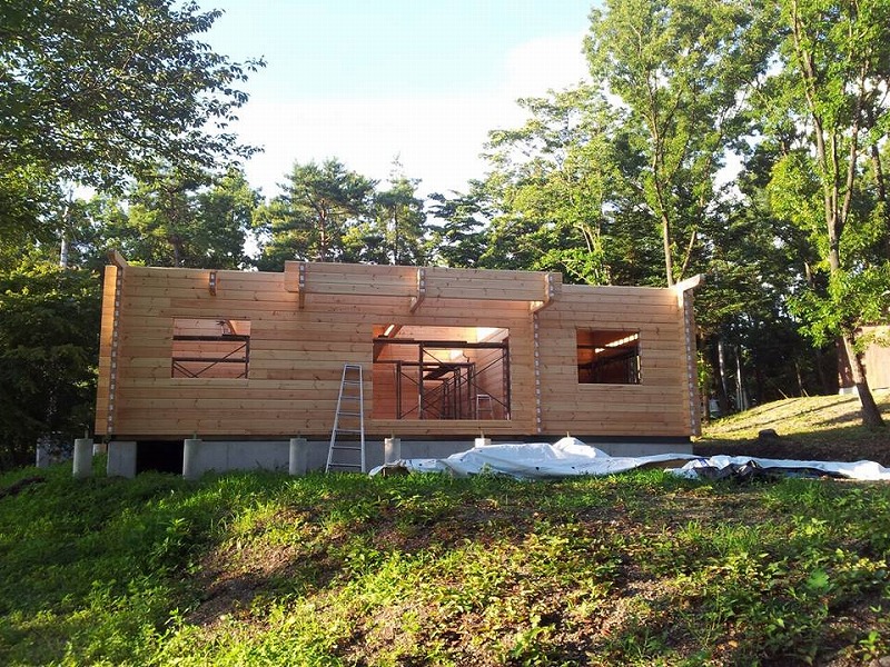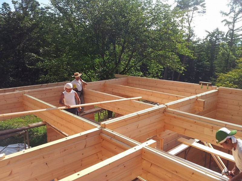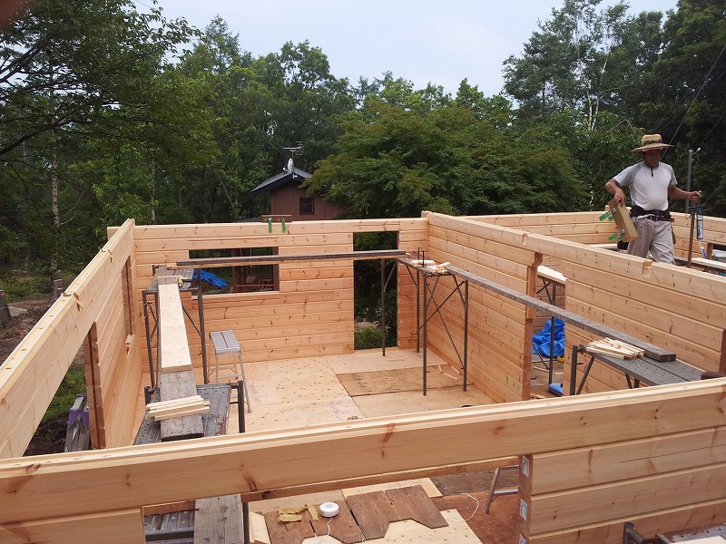 今週はいい天気に恵まれて昭和村I邸様建て方工事進んでいます。 いい天気すぎて日中の気温はぐんぐん上昇。 午後にはかなり体がきつくなってきますが職人さんたちに頑張ってもらい昨日まででログ壁17段まで積み上げました。 3時からは2F根太工事を進めて2Fステージをつくり昨日は作業終了。 今日は天気が悪そうですが工事進めていきたいと思います。