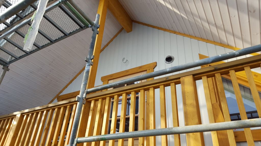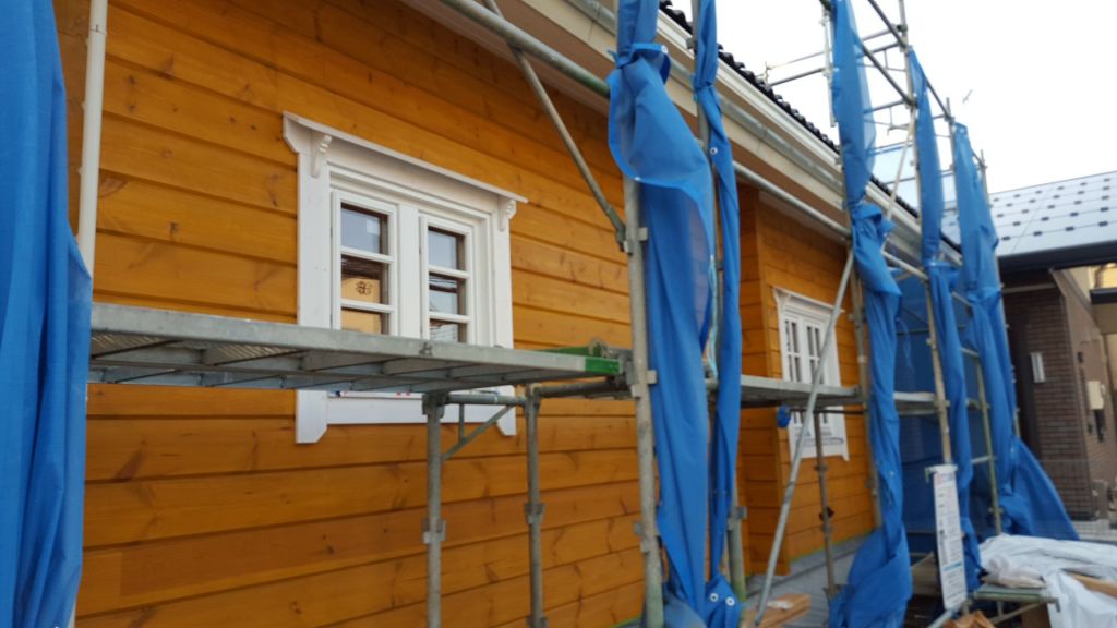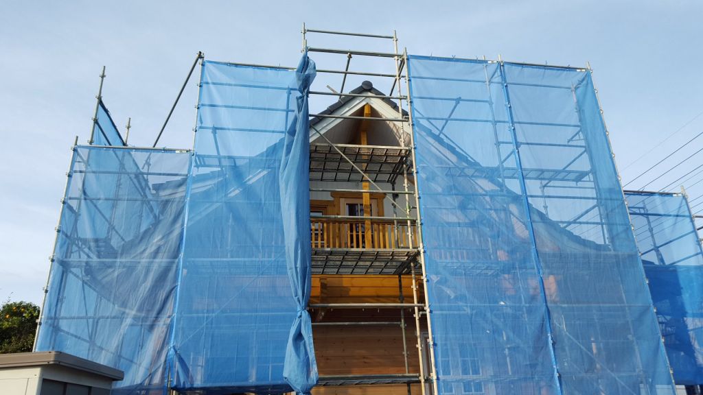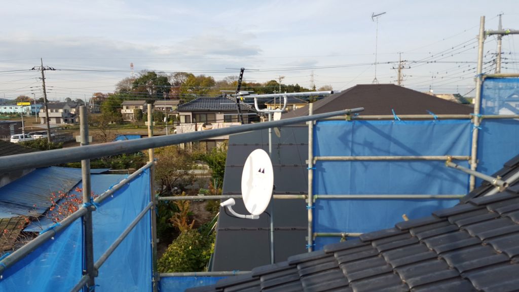 仕事ですが朝5時起きして埼玉F邸様現場に行きました! 本日足場を解体するのでその前に足場がなければできない仕事をこなしてきました。 そうアンテナ工事と外部フード取り付け工事です。 フードは至って簡単に取り付けられましたが、アンテナ取り付けが結構難関でした。 F様いわくこの辺の土地は電波が悪いらしくアンテナを高く取り付けないといけないということでなるべく高い位置に取り付けさせていただきましたが、最初は14素子のアンテナでレベルはかってもほとんど数値が上がらない、これじゃダメかなと思い近くのコメリへ20素子アンテナが売っていたので買ってきて取り付けしましたが、それでもチェッカーのレベルが上がらない。 おかしいな~と思い実際テレビを映してみようということになりF様が小さいテレビをもってきてくださいました。 線をつなげたらばっちりOK! チェッカーのレベルが壊れていたのかもしれません(泣) アンテナ工事も無事に終わり解体の準備へ! セルフペイントで塗られた壁や窓はいい感じに仕上がっていますよ!
